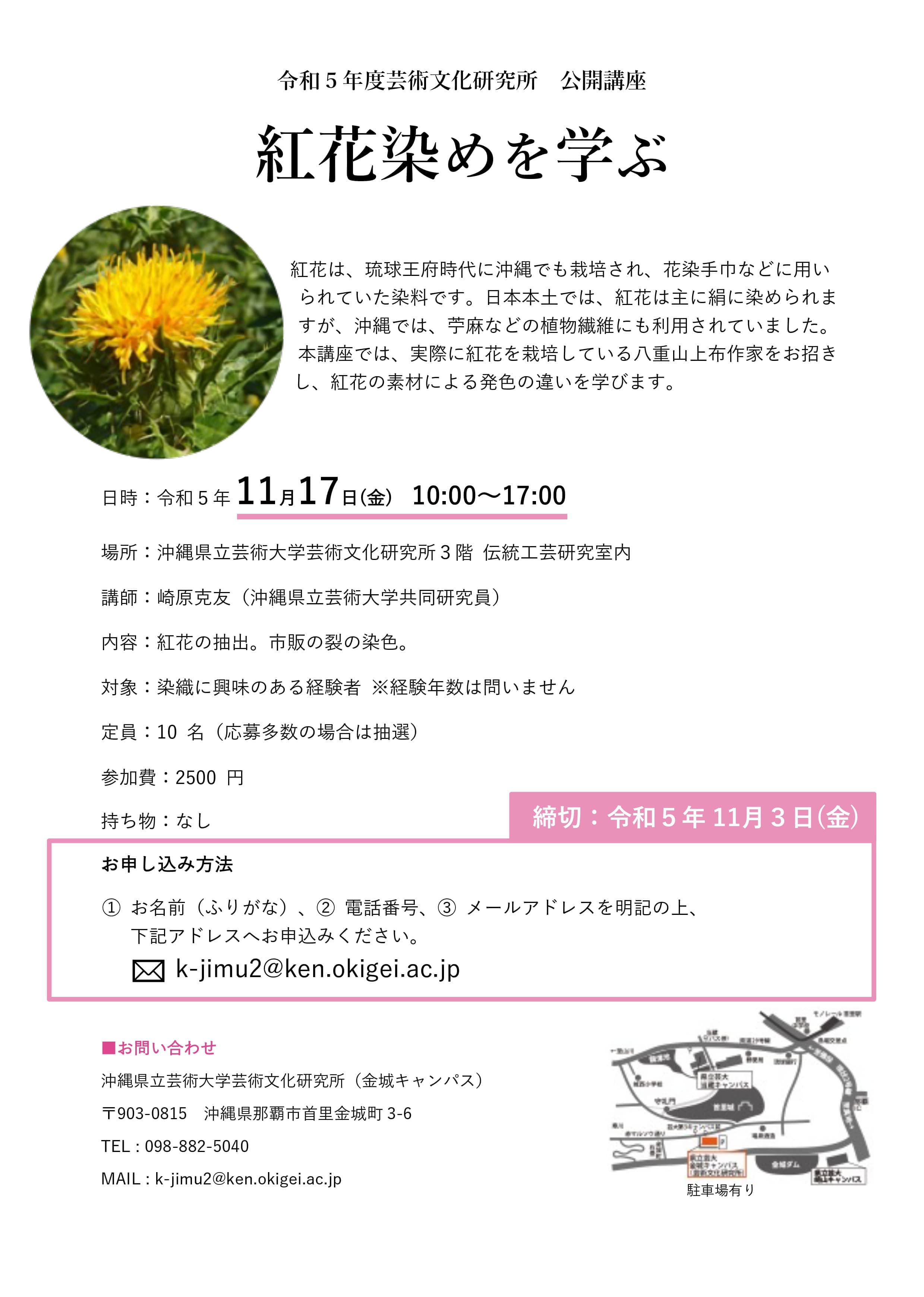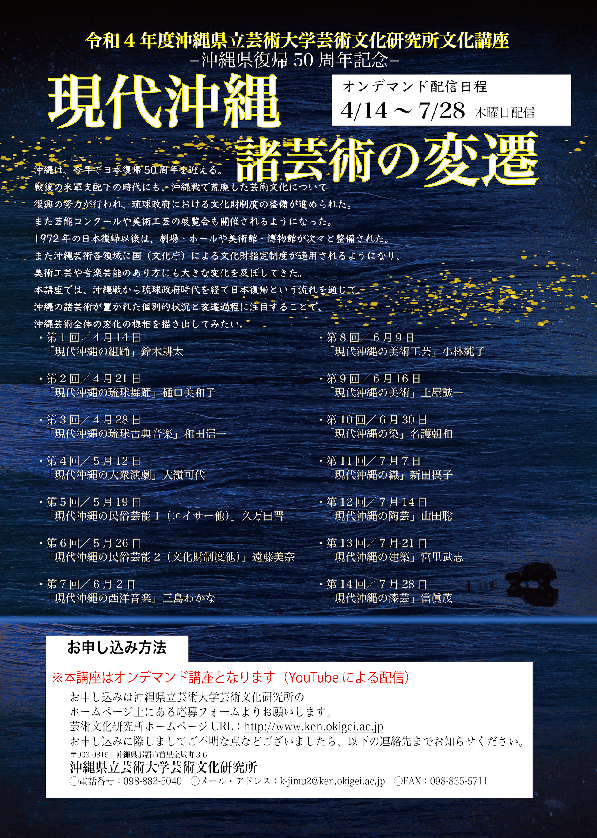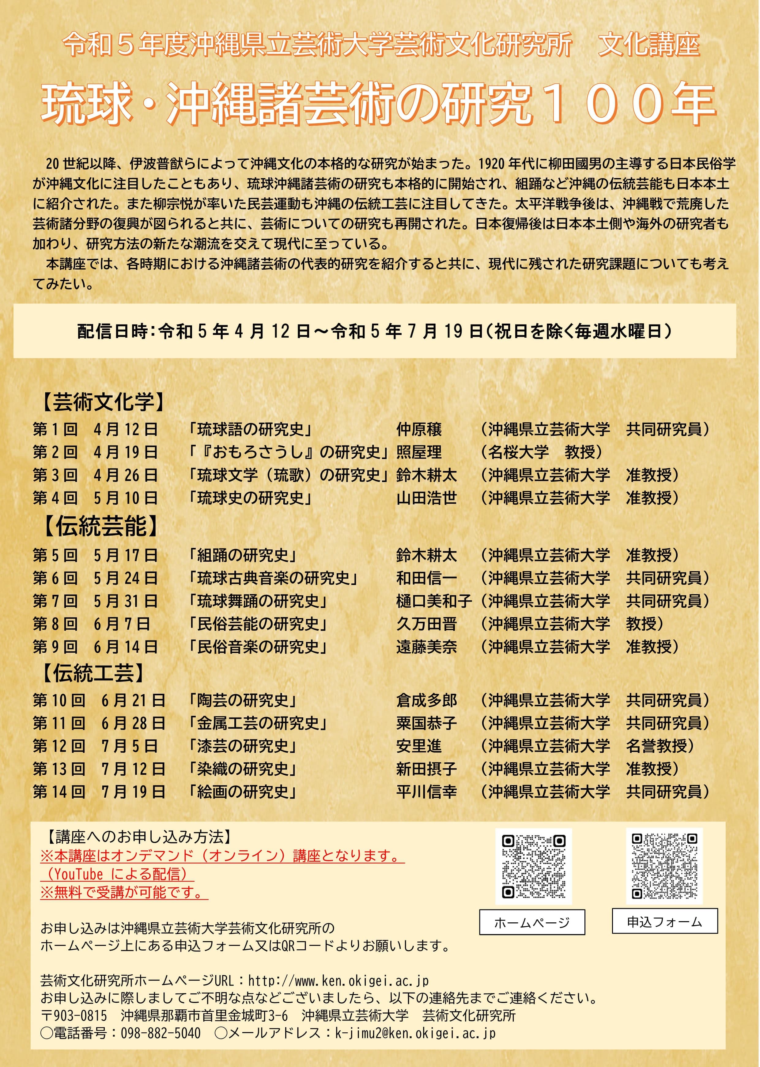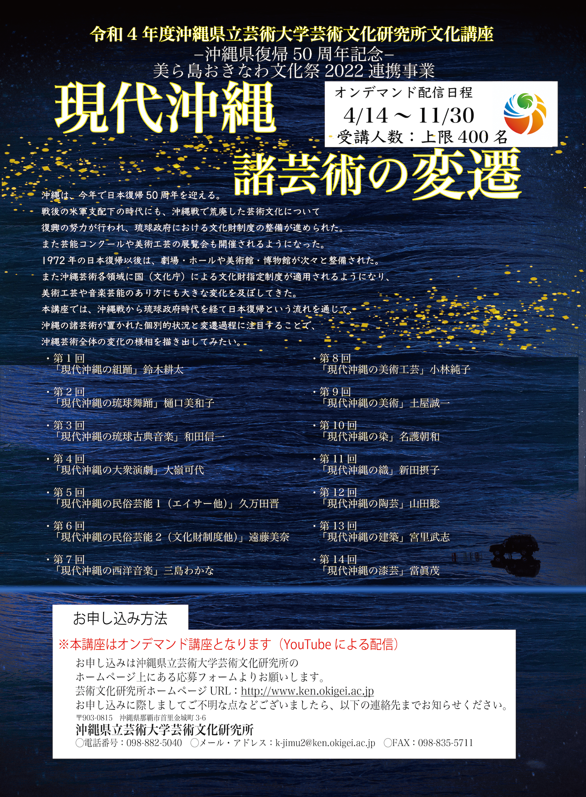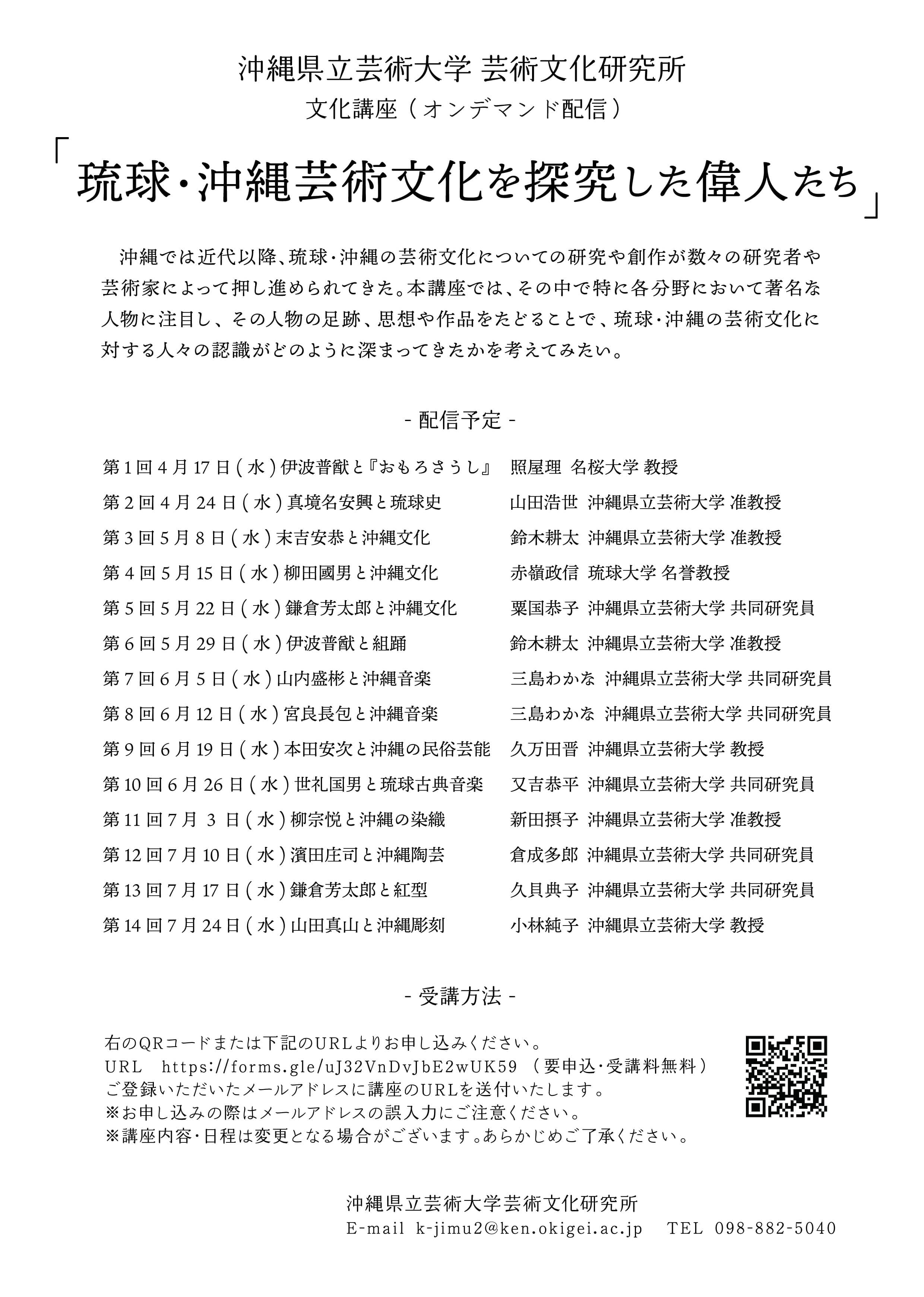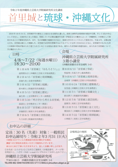 沖縄県立芸術大学芸術文化研究所が主催する「文化講座・公開講座」は年数回開催される講座で、学生はもちろん、一般の方も受講できます。