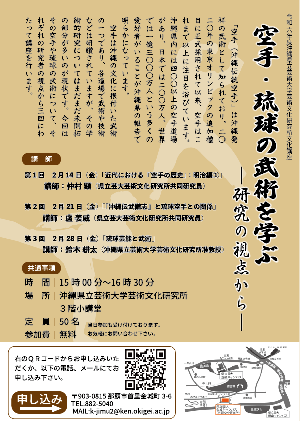 空手は沖縄の文化に根付いた武術の一つであり、各道場で武術や技術などは研鑽されていますが、その学術的研究についてはまだまだ未開拓の部分が多いのが現状です。今回はその空手や琉球の武術について、それぞれの研究者の視点から三回にわたって講座を行います。