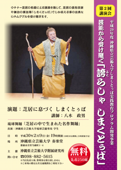 ウチナー芝居の名優・八木政男氏による講演と芝居の上演を通して、芝居の喜怒哀楽や芝居の裏話等「しまくとぅば」でしか伝える事の出来ない言葉を受け継ぎます。