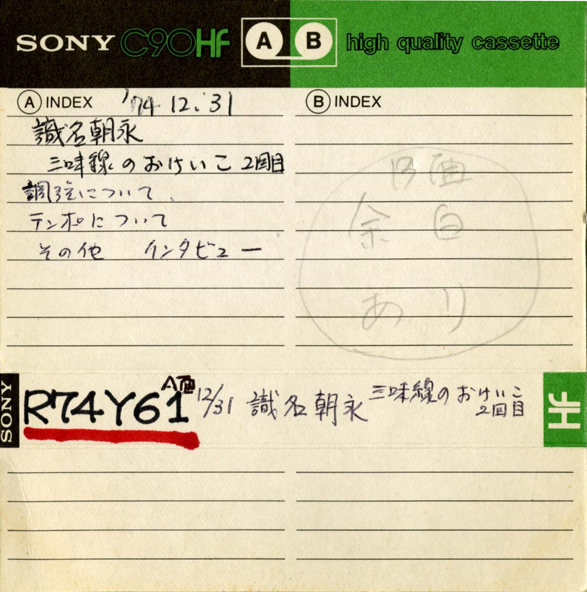 1974/12/31 識名朝永 三味線のおけいこ 2回目 No. 319 テープ番号:R74Y061 演唱者:識名朝永 録音地域: 録音日1:1974/12/31 録音日2: 録音日3: 備考1: 備考2: 備考3: R74Y061 A面 12/31 識名朝永 三味線のおけいこ2回目 A面 '74 12.31 識名朝永 三味線のおけいこ2回目 調弦について テンポについて その他 インタビュー B面 余白あり