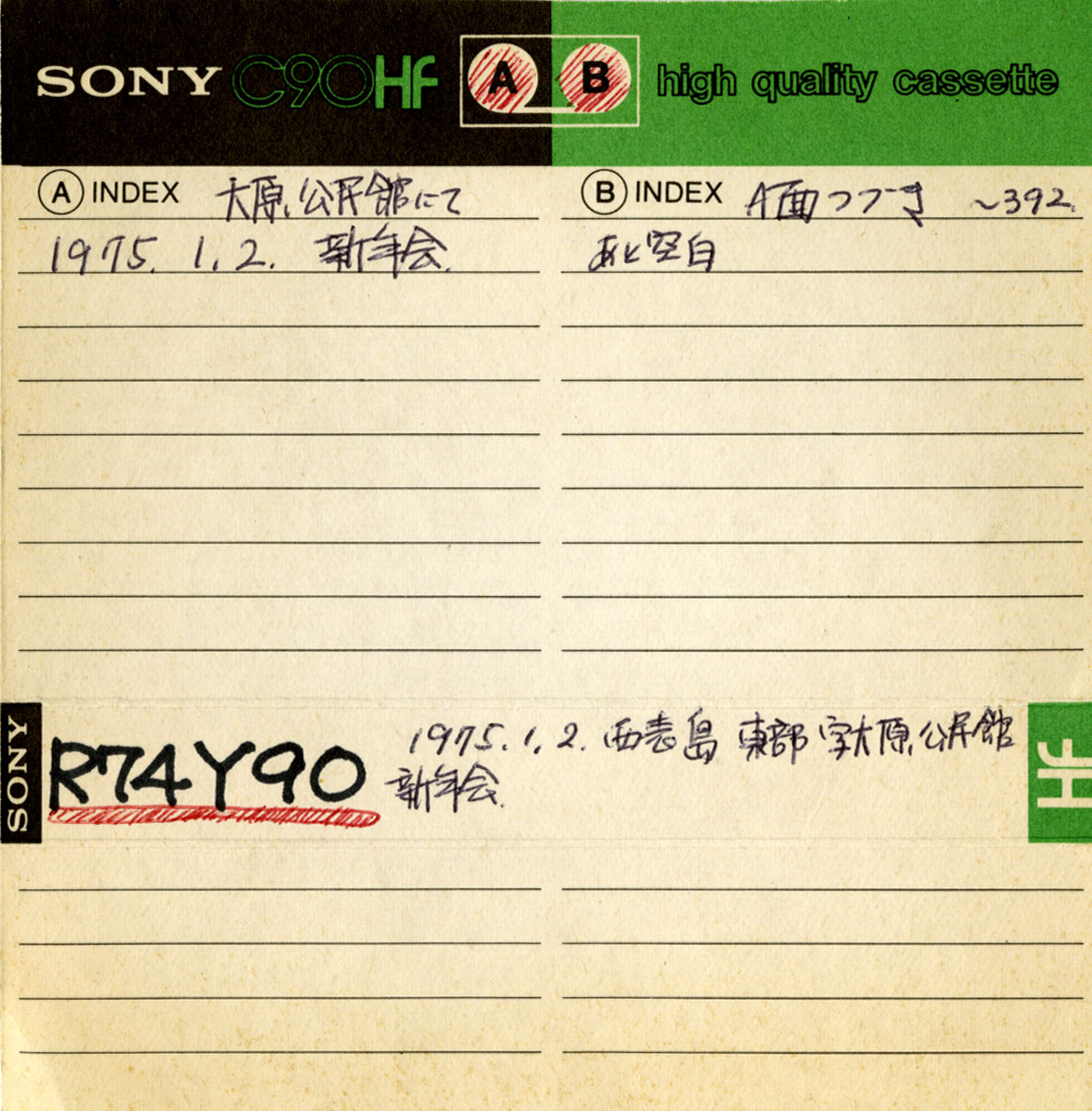 1975/01/02 新年会 No. 348 テープ番号:R74Y090 演唱者: 録音地域:竹富町大原 録音日1:1975/01/02 録音日2: 録音日3: 備考1: 備考2: 備考3: R74Y90 1975.1.2 西表島 東部 字大原公民館 新年会 A面 大原公民館にて 1975.1.2 新年会 B面 A面のつづき ~392 あと空白