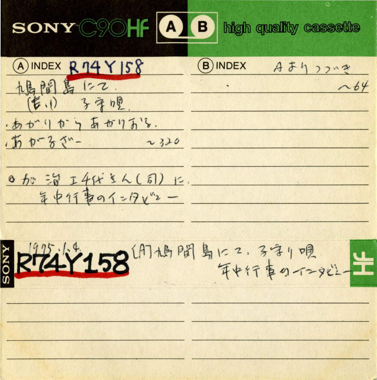 1975/01/04 子守唄/年中行事のインタビュー No. 416 テープ番号:R74Y158 演唱者: 録音地域:鳩間島 録音日1:1975/01/04 録音日2: 録音日3: 備考1: 備考2: 備考3: R74Y158 1975.1.4 〔A〕鳩間島にて 子守り唄 年中行事のインタビュー A面 R74Y158 鳩間島にて (E.1)子守り唄 ・あがりからあがりおる ・あがるざー ~320 ◎加治工千代さん(司)に 年中行事のインタビュー B面 Aよりつづき ~64