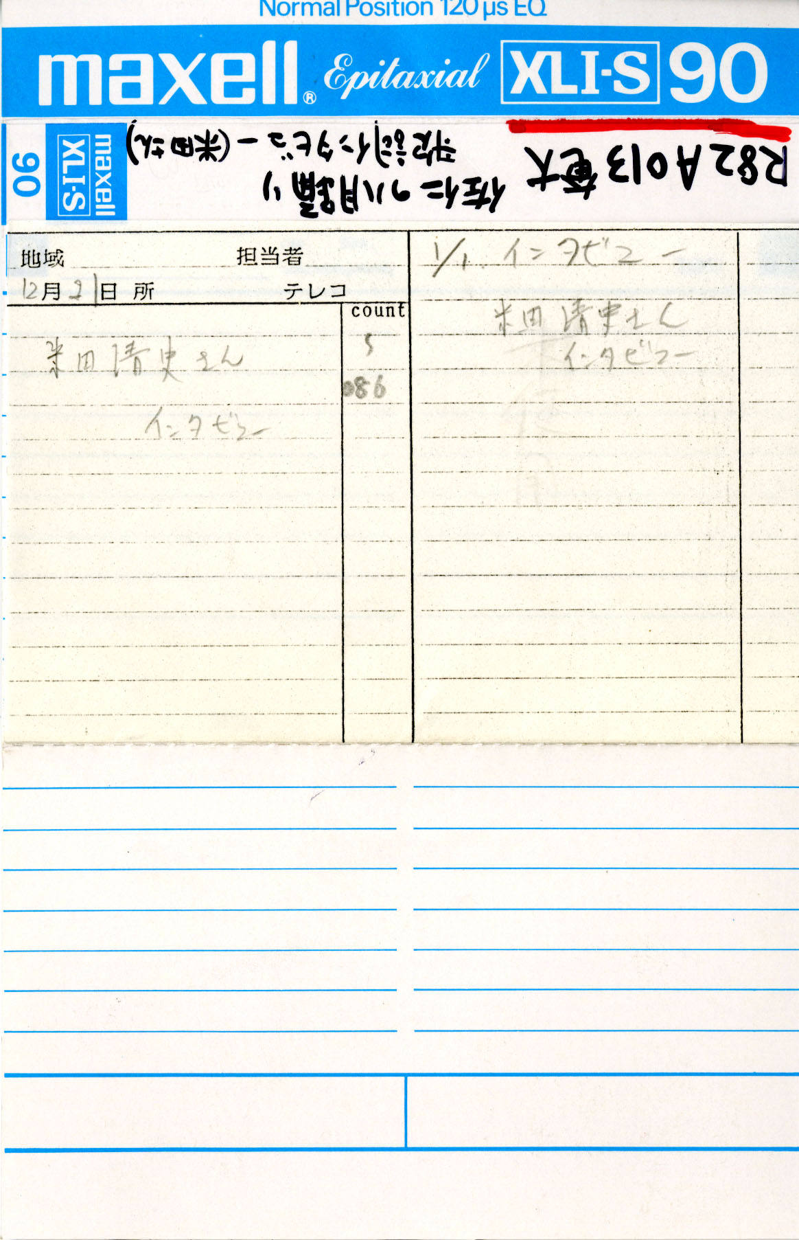 1982/12/21 佐仁の八月踊り 歌詞インタビュー No. 734 テープ番号:R82A013 演唱者:米田清史 録音地域:笠利町佐仁 録音日1:1982/12/21 録音日2:1983/01/01 録音日3: 備考1: 備考2: 備考3: R82A013 奄大 佐仁の八月踊り 歌詞インタビュー(米田さん) A面 12月21日 count 米田清史さん ~086 インタビュー B面 1/1 インタビュー 米田清史さん インタビュー