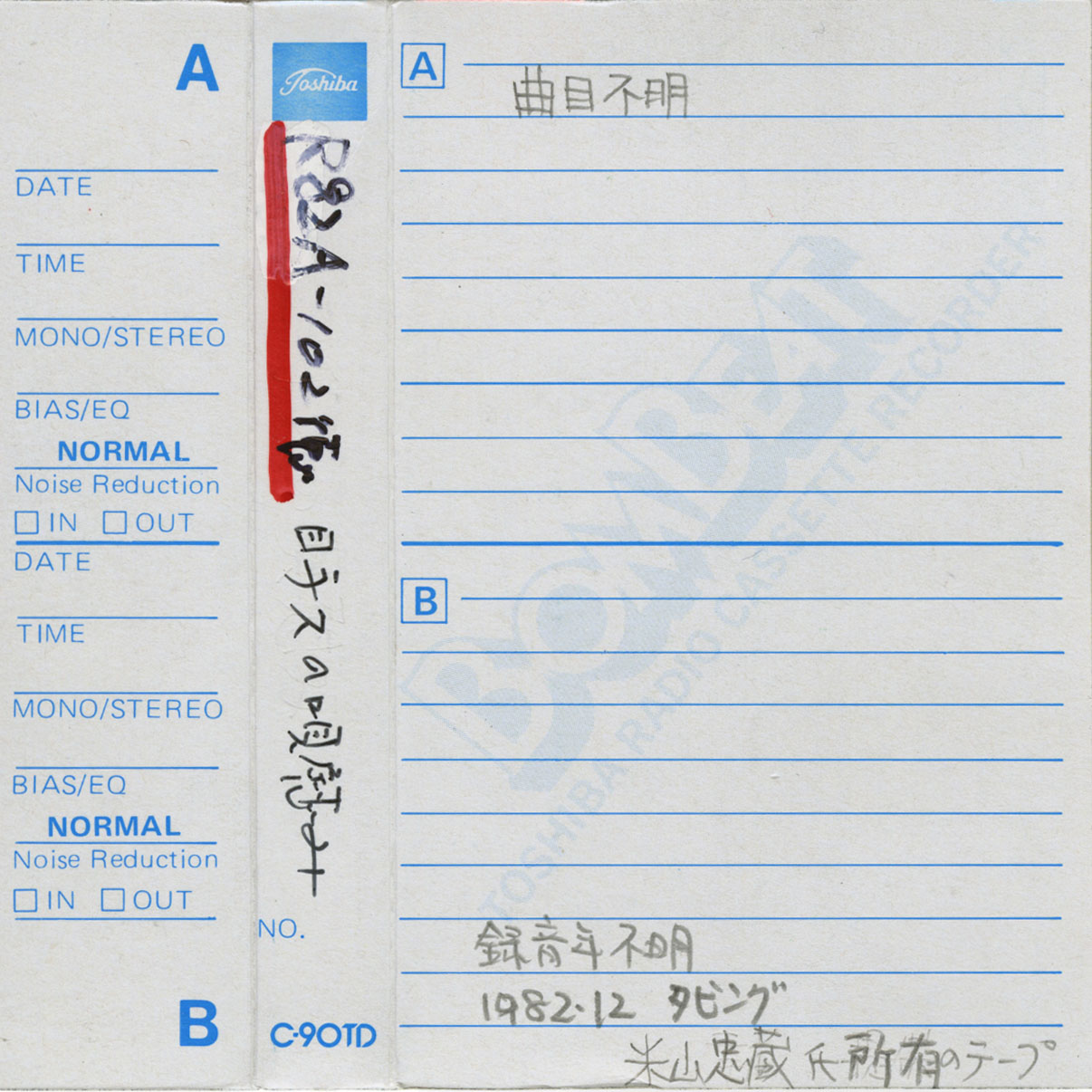 2020/03/18 目手久の唄慰み No. 823 テープ番号:R82A102 演唱者: 録音地域:伊仙町目手久 録音日1:2020/03/18 録音日2: 録音日3: 備考1: 備考2:欠番(→赤テープ発見2012) 備考3:米山忠蔵所有テープのダビング R82A102 徳 目手久の唄慰み A面 曲目不明 B面 録音年不明 1982.12 ダビング 米山忠蔵氏所有のテープ