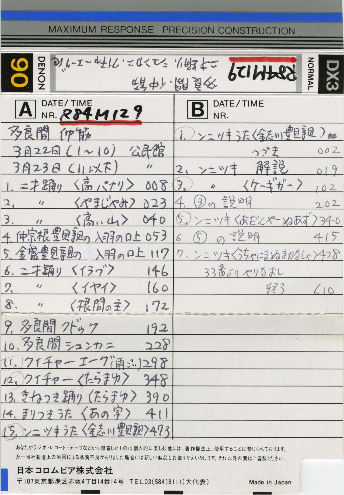 1984/03/22 二才踊り、シュンカニ、クイチャーエーグ他 No. 1051 テープ番号:R84M129 演唱者: 録音地域:多良間村仲筋 録音日1:1984/03/22 録音日2:1984/03/23 録音日3: 備考1: 備考2: 備考3: