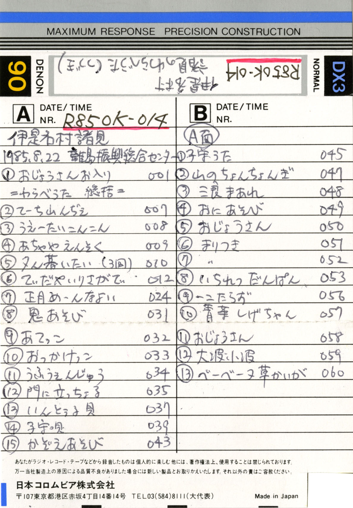 1985/08/22 諸見のわらべうた No. 1081 テープ番号:R85OK014 演唱者: 録音地域:伊是名村 録音日1:1985/08/22 録音日2: 録音日3: 備考1:伊是名村離島開発総合センターにて録音 備考2: 備考3: