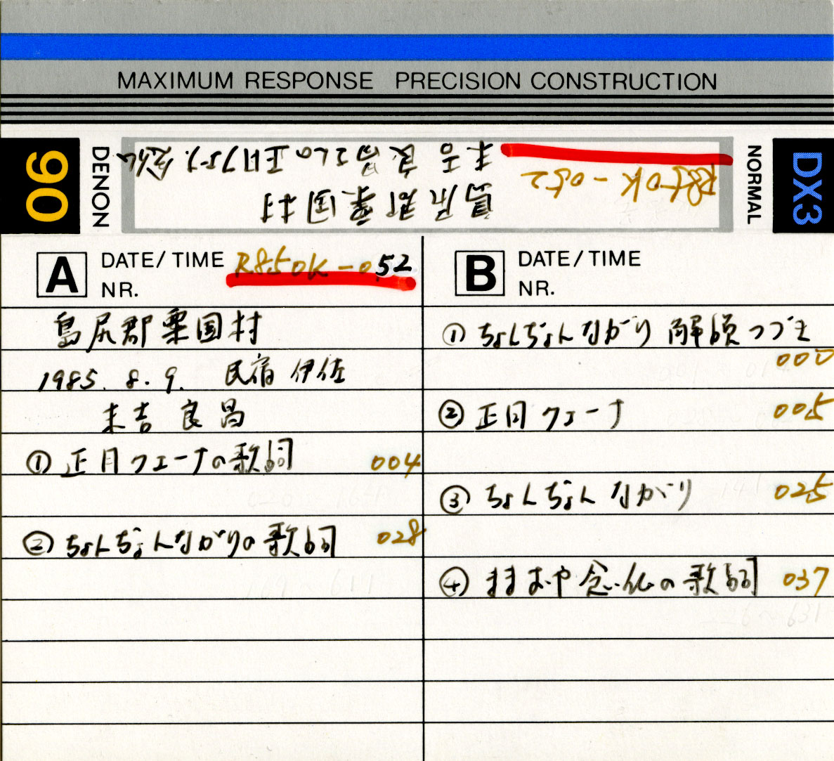 1985/08/09 正月クェーナ、念仏 No. 1119 テープ番号:R85OK052 演唱者:末吉良昌 録音地域:島尻郡粟国村 録音日1:1985/08/09 録音日2: 録音日3: 備考1: 備考2: 備考3: R85OK052 A面 島尻郡粟国村 1985.8.9. 民宿伊佐 末吉良昌 ①正月クエーナの歌詞 004 ②ちょんぢょんながりの歌詞 028 B面 ①ちょんぢょんながり解説つづき 000 ②正月クエーナ 005 ③ちょんぢょんながり 025 ④ままおや念仏の歌詞 037