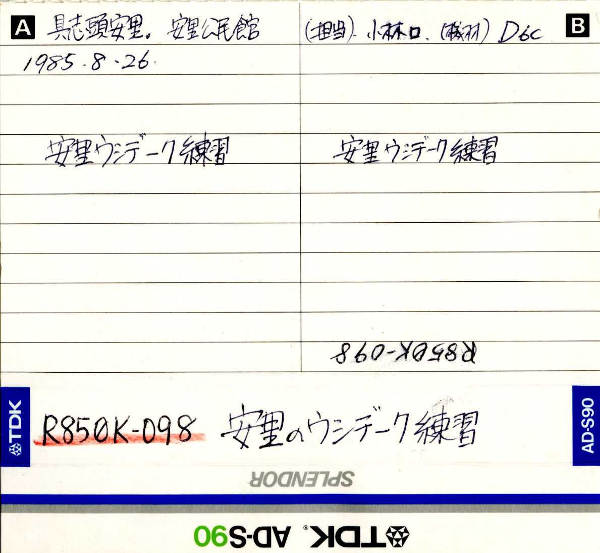 1985/08/26 ウシデーク練習 No. 1165 テープ番号:R85OK098 演唱者: 録音地域:具志頭村安里 録音日1:1985/08/26 録音日2: 録音日3: 備考1: 備考2: 備考3: R85OK098 A面 具志頭安里、安里公民館 1985.8.26 安里ウシデーク練習 (担当)小林口 (機材)D6C 安里ウシデーク練習 R85OK098-1 A面 8月26日 具志頭安里 テレコDのD6C 安里公民館 小林口 ・安里うしでーく練習 B面 つづき