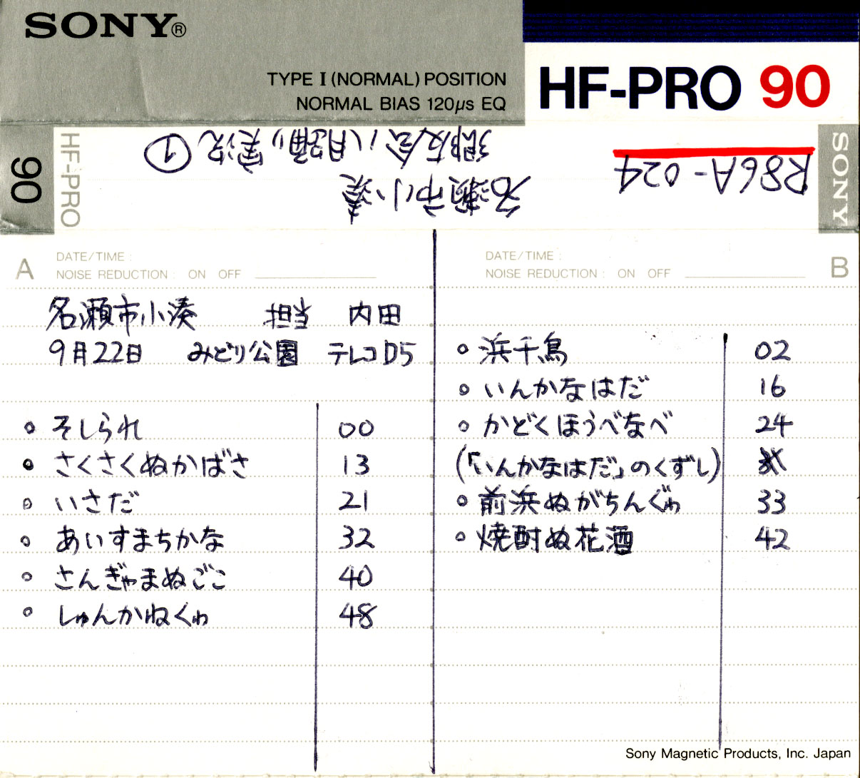 1986/09/22 郷友会八月踊り(実況)① No. 1218 テープ番号:R86A024 演唱者: 録音地域:名瀬市小湊 録音日1:1986/09/22 録音日2: 録音日3: 備考1:2本あり 備考2: 備考3: