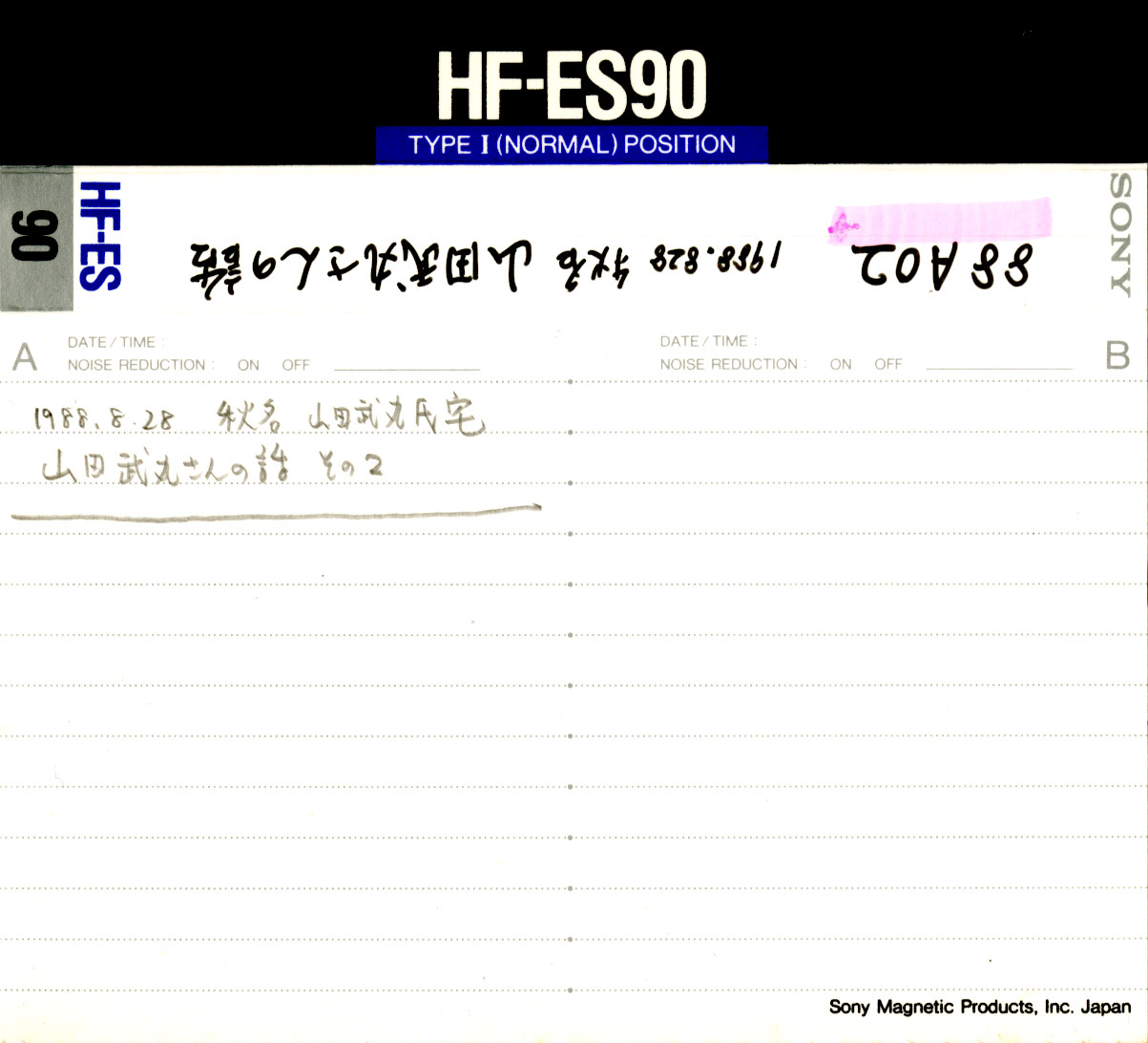 1988/08/28 山田武丸さんの話 No. 1373 テープ番号:R88AM002 演唱者:山田武丸 録音地域:龍郷町秋名 録音日1:1988/08/28 録音日2: 録音日3: 備考1: 備考2: 備考3:追加登録:新規レコード(2013/04/16)B面:CD化ののち波形から録音なし(遠藤)